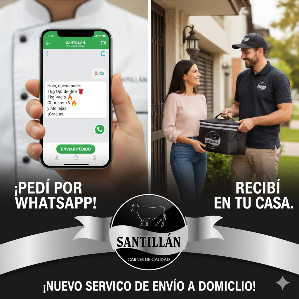 ¡Atención, amantes de la buena carne! En Carnes Santillán, sabemos lo importante que es la comodidad en tu día a día. Por eso, con gran entusiasmo, te anunciamos nuestro nuevo servicio de Pedidos por WhatsApp con Envío a Domicilio.